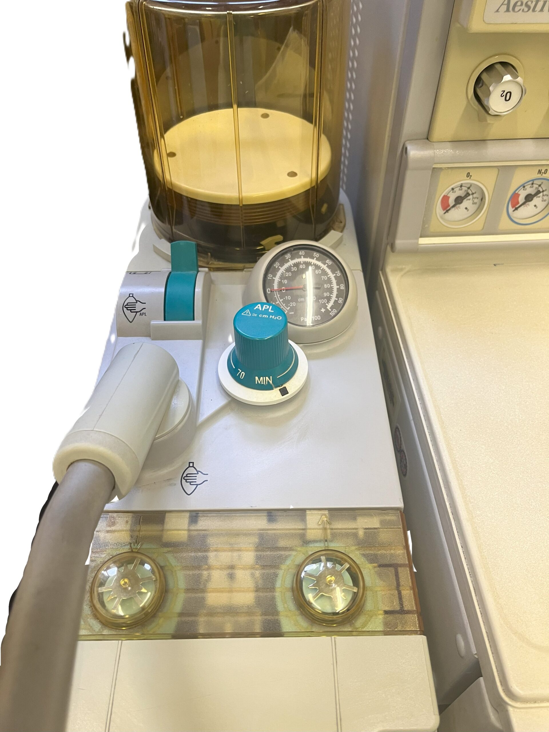 The Aespire 7900 is a compact, integrated and intuitive anaesthesia delivery system. The ventilator portion provides mechanical ventilation to a patient during surgery as well as monitoring and displaying various patient parameters, providing advanced patient monitoring technology, without the high anaesthesia delivery cost. The 7900 features optional integrated auxiliary O2 flowmeter and suction control/pressure waveform, Advanced Breathing System (ABS), One Step Bag/Vent switch with a Pressure Bar graph to provide a visual reference. There are minimal parts and tube connections on the 7900 to reduce the potential for leaks and misconnections.