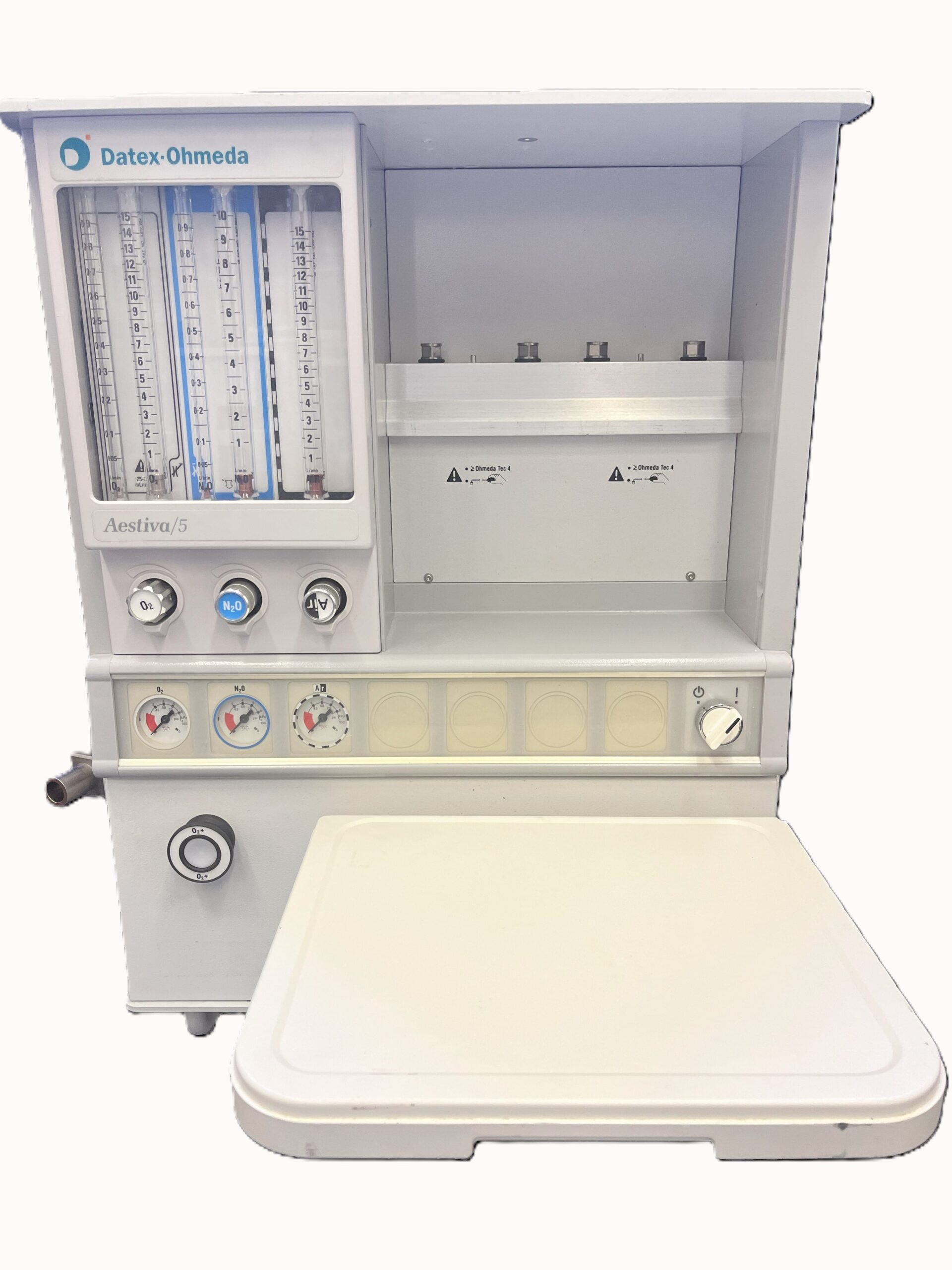 • Proven Aestiva pneumatic gas mixing and hypoxic guard, minimum O2 flow of 50mL, smooth faster acting fresh gas flow control, 2 vaporiser positions (tec 4 or greater).
