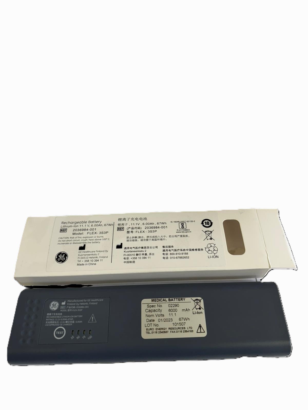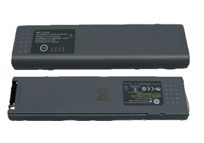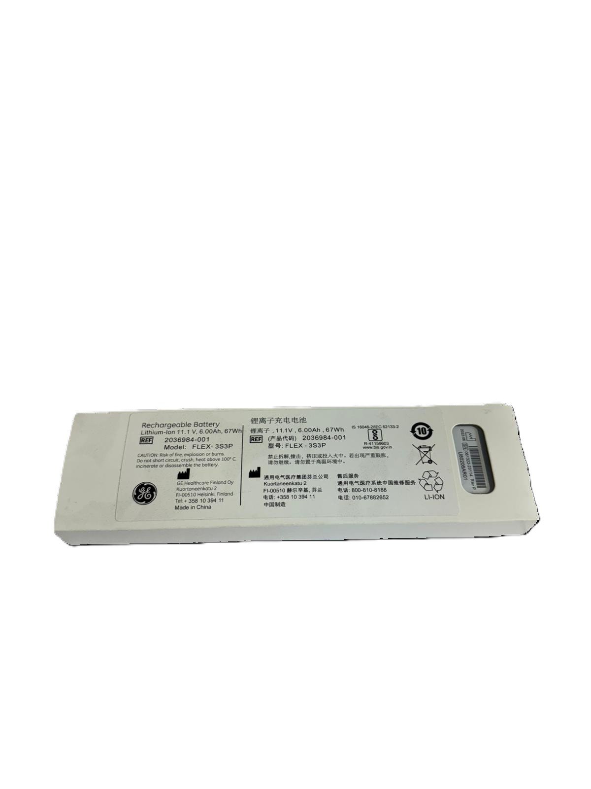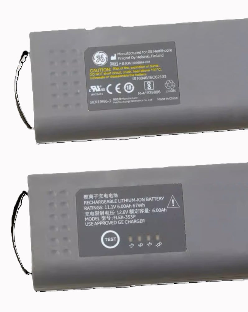 The rechargeable Battery Flex-3S3P 11.1V 18650 LI-Ion SMBUS is a specially designed battery intended for use in GE anaesthesia and patient monitoring modules. The Li-ion battery is a type of rechargeable battery in which lithium ions move from the negative electrode to the positive electrode during discharge and back when charging. It has inbuilt charge level indicator window.