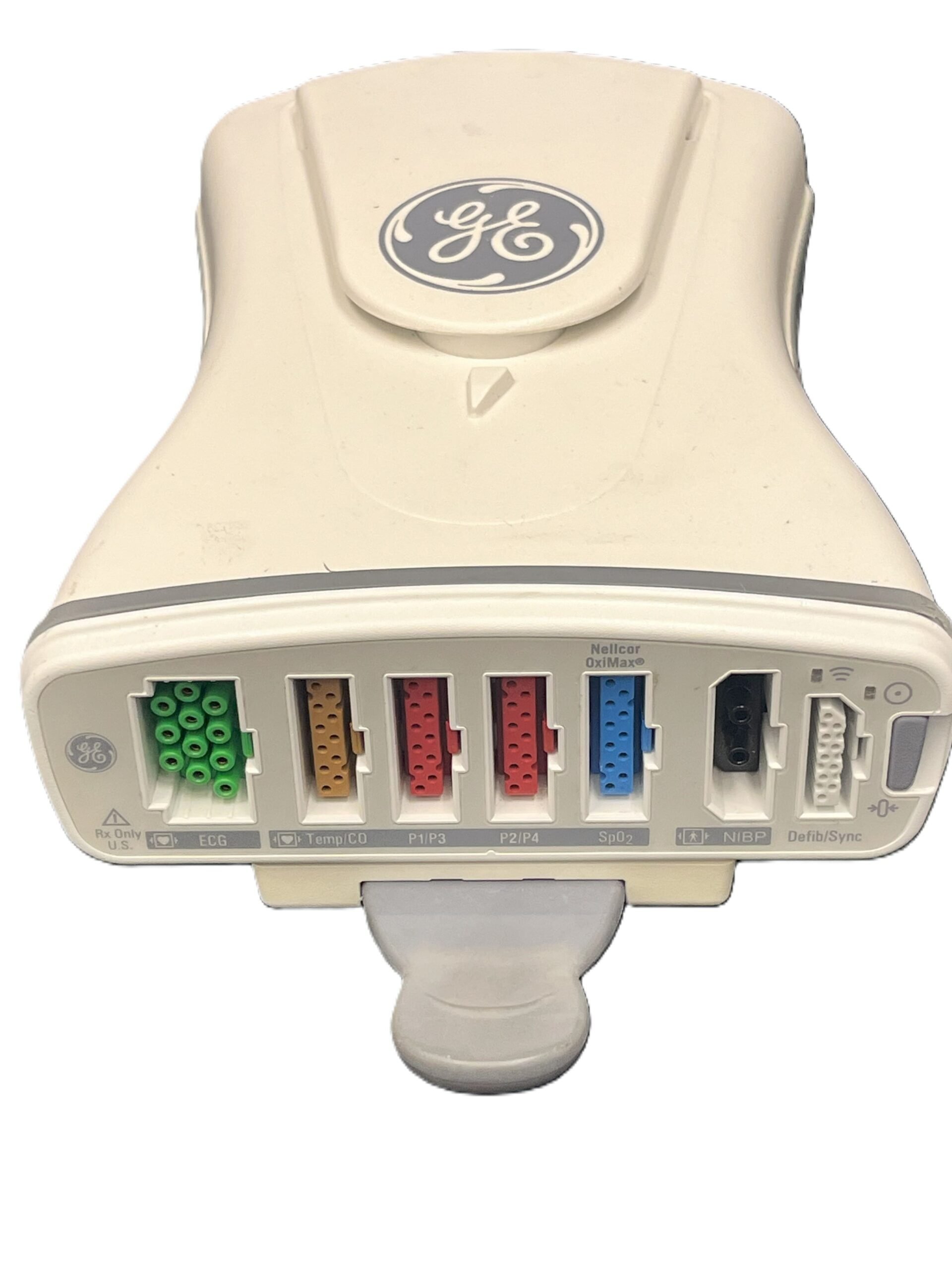 The Patient Data Module is a data acquisition device for a GE modular system. It provides a connection from the host monitor to the patient, processes the patient data signals and stores a limited amount of patient data (24 hours captured at 1 min resolution) for seamless transport. PDMs connect to a bedside or transport patient monitor using the host interface connector. The data that it collects, converts, and sends include the patient’s vital signs and physiological waveforms. It also stores patient history including trends and special events, and setup information such as blood pressure zero points and alarm limit settings. The patient history is stored so that the collected information is transferred when a patient is transferred to a different monitor.