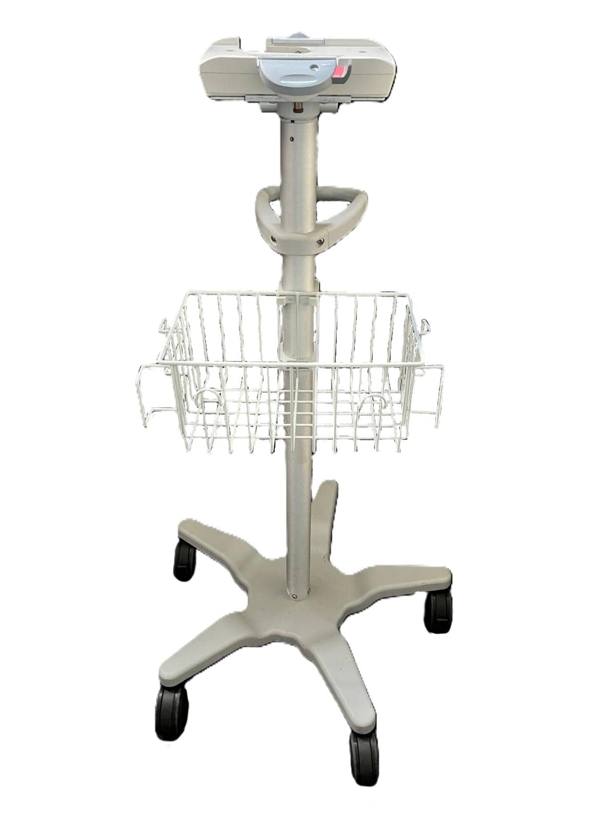 GCX durable mobile platform with 10 degree fixed tilt with a fixed height monitor trolley additional feature includes the GE Quick Mount attachment allowing a monitor to be added or removed from the plate in seconds. Features a 5-Leg base (with locking EuroCastors), pull handle with padded grip, Basket with Cord Wrap and Cable Hooks for cable management.